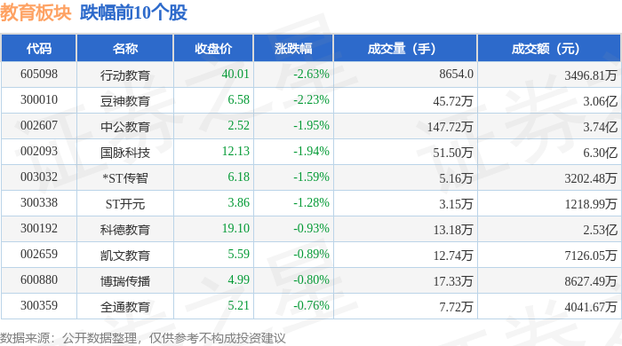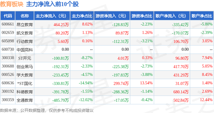 从资金流向上来看,当日教育板块主力资金净流出1.9亿元,游资资金净流入2663.87万元,散户资金净流入1.63亿元。教育板块个股资金流向见下表: